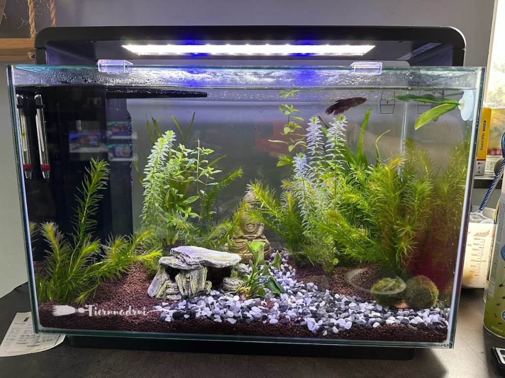 Op dit moment heb ik één aquarium met 20 schoolvissen en vier verschillende planten, waarvan één afkomstig is uit het aquarium van Stef’s nonkel. Daarnaast heb ik nu een tweede aquarium dat stevig is beplant met planten die geschikt zijn voor mijn betta. De oppervlaktebeweging van het water is zachter en de filter veroorzaakt minder stroming, zodat deze mooie blauwe vis een rustige omgeving heeft om zich in te amuseren.