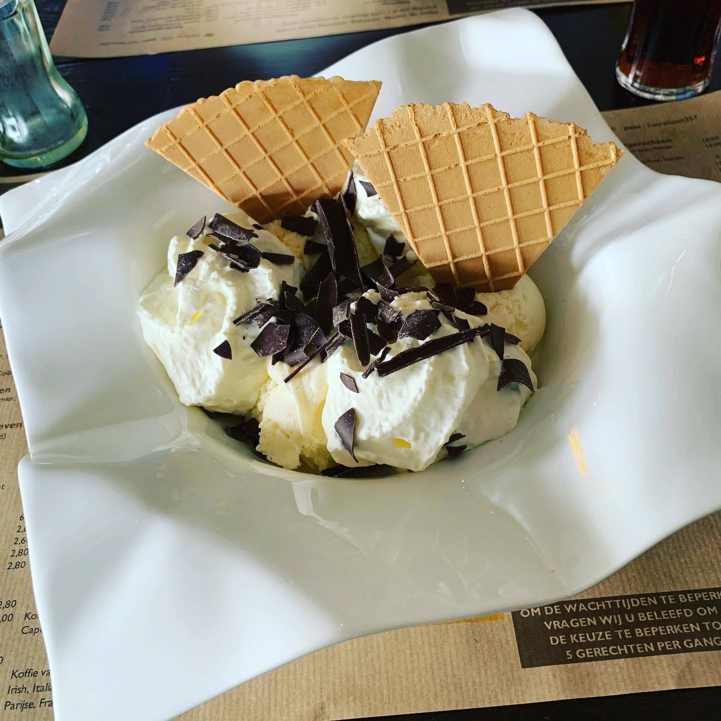 Maandag, pinkstermaandag. Een vrije dag. Tussen de buien door hebben we er van geprofiteerd om een terrasje te doen. Hadden we geluk dat we gereserveerd hadden voor het enige uur die dag dat de regen even in rust was. Een veel te grote dame blanche achter de kiezen gestoken. Oh, zo lekker.