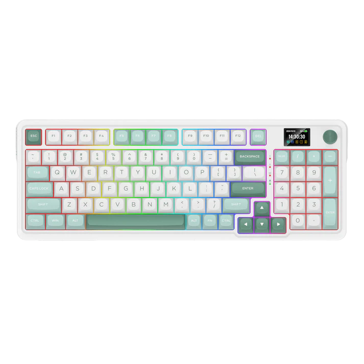 En ja hoor! Na wat slim filteren in de webshop, verscheen daar het toetsenbord dat ik nu met zoveel liefde aan het beklikken ben voor deze blog. Oh, dat zalige klikgeluid tijdens het typen! 😍 Alhoewel, ik denk dat ik voor de spatiebalk een switch ga zoeken die iets minder feedback geeft. Het is een prachtig wit toetsenbord met een heerlijk nostalgische uitstraling, en die RGB-verlichting is helemaal instelbaar – het RGB-licht reageert als je een toets indrukt. En het beste van alles: het is hot swappable! Dus als het geklik me ooit begint te storen (want ja, er zijn periodes dat ik een stil toetsenbord wil), kan ik het gewoon aanpassen. Hoe handig is dat?!